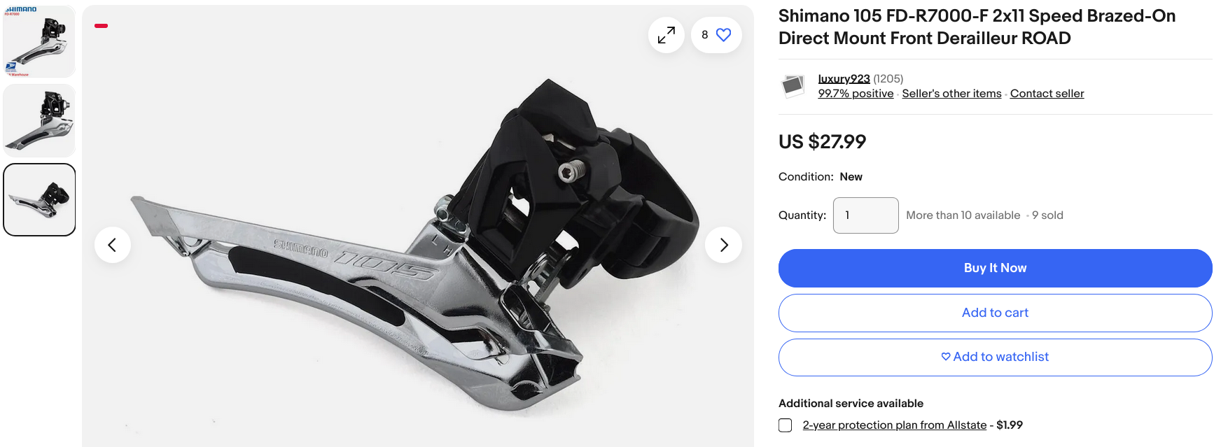 Image URL https://www.ebay.com/itm/386887587102 Vendor Ebay Parts Shimano 105 R7000 Front Derailleur Part variations Shimano 105 R7000 Front Derailleur FD-R7000-F Braze on Price $27.99 Listing status Available Listing type Buy it now Shipping type Free Listing grade New Listing condition New