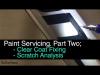 Heavier scratches through the clear coat to the paint need to be smoothed out, re-painted, and re-coated.